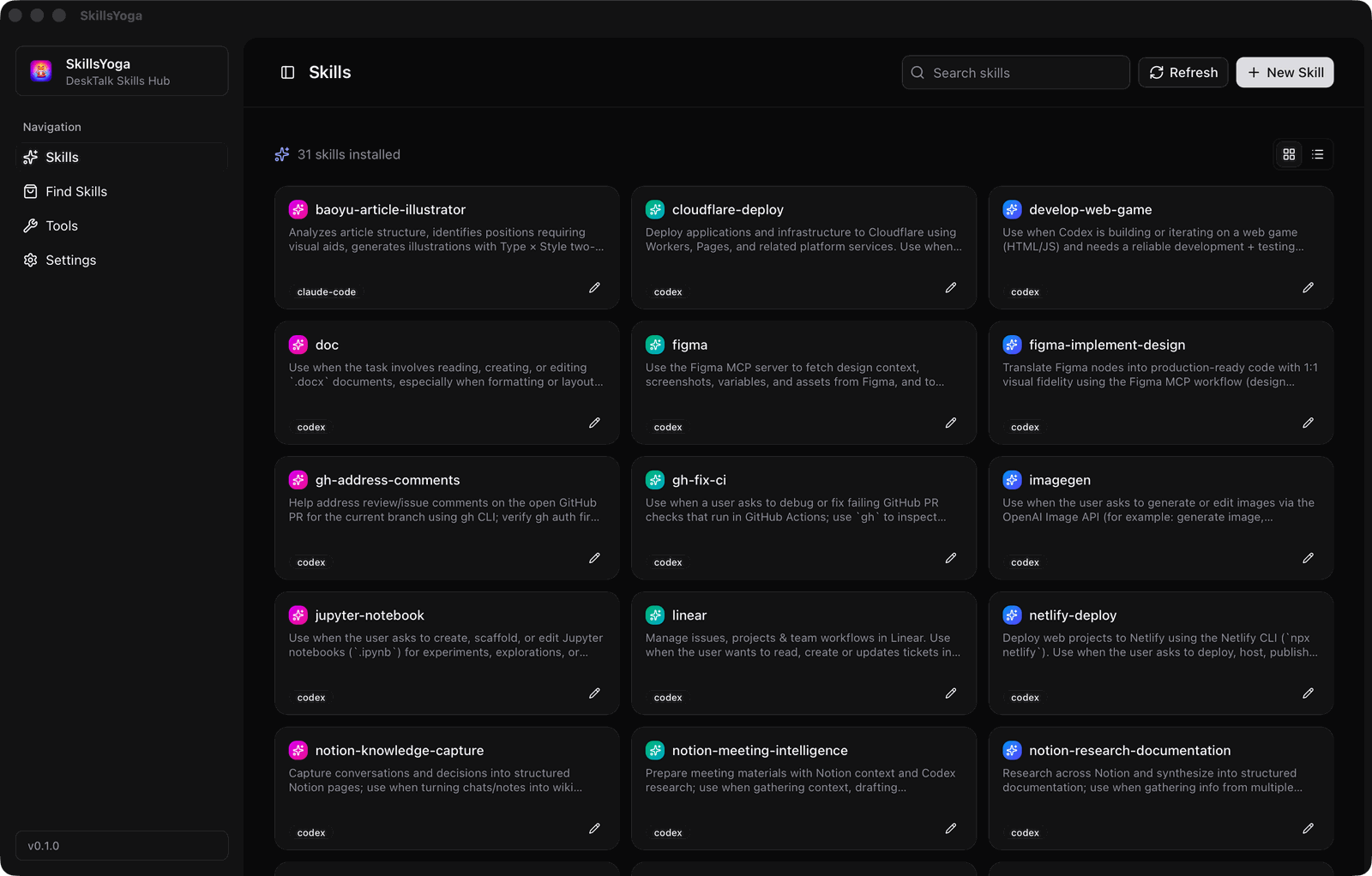 SkillsYoga is a desktop app that helps you create, edit, organize and import SKILL.md-based skills for all your AI coding tools in one unified interface.